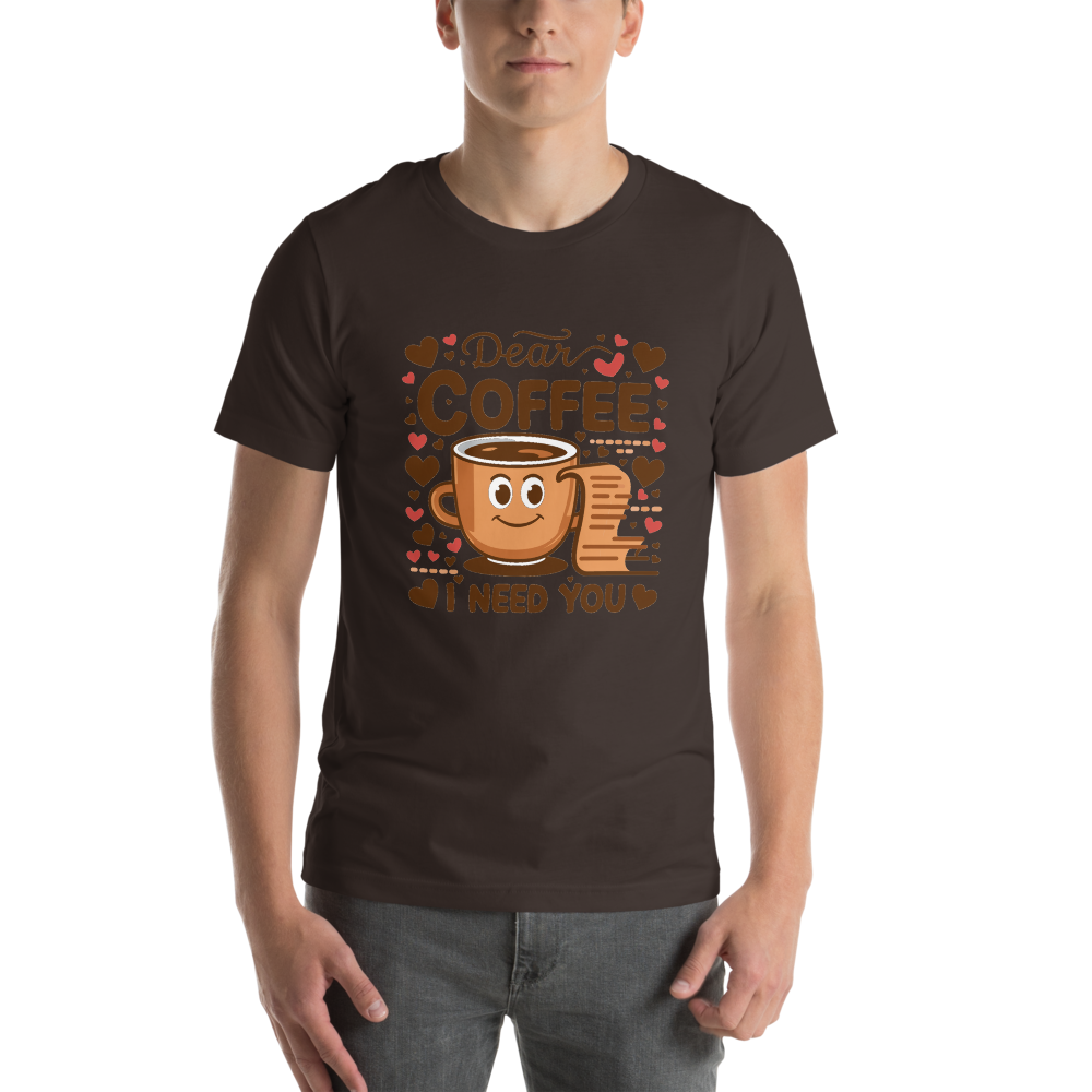 Enhance your wardrobe with this charming casual T-shirt. It features a dark brown base color and a front-center screen-printed graphic of a smiling cartoon coffee cup holding a note, surrounded by the text “Dear COFFEE I NEED YOU” and red/pink hearts. The warm graphic palette and humorous coffee-centric design make it a standout piece.